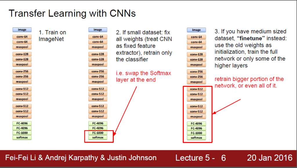 A better option which would allow us to leverage the performance of neural networks without the need for humongous training data is Transfer Learning. We can attempt to use the “knowledge” gained by another deep-learning model trained for a fairly similar task over a much larger amount of data. For a CNN already trained to perform an image classification task, this means we can “cut the head” of the model by removing the final fully-connected layers performing the classification and re-use the output of the other layers to feed into our own classifier. We would therefore only keep the convolutional layers and use them as a feature extractor. Because the model has been trained on similar data, but on a much larger scale, it has had the chance to learn a wide range of features that will also be relevant to our classification task and which we would never be able to learn from a dataset made up of a few dozen pictures.