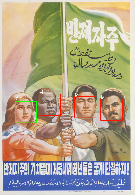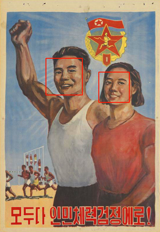 Since available face detection algorithms are trained on real-life pictures rather than drawings, their might not perform as well on our dataset. However, because North Korean art is heir to socialist realism, characters in the posters are depicted very realistically and their facial topology closely resembles that of a real-life human face. We are also mostly interested in the central figures of the poster, so the weaker detection rate on smaller, background faces is actually more of a noise filter for our task. Finally, the fact that the posters are artistic depictions also gives us an advantage over usual photographic datasets. One of the main challenges to face detection algorithm is pose, with awkward angles having a very negative impact on accuracy. Because the characters’ poses in the posters are all aesthetically staged and predominantly forward facing, their faces should be easier to recognize.