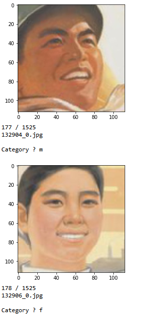The posters’ metadata contains topical tags that tells us whether the poster is about industry, agriculture, sports… There is however much less information about who, if anyone, actually is in the posters. Some posters have an extra entry in their database with a detail description of their content, but they are relatively few in numbers. We can, however, use some computer vision algorithm to detect people in posters and classify them by gender. This, in turn, would give us a sense of how social activities are gendered in the DPRK.