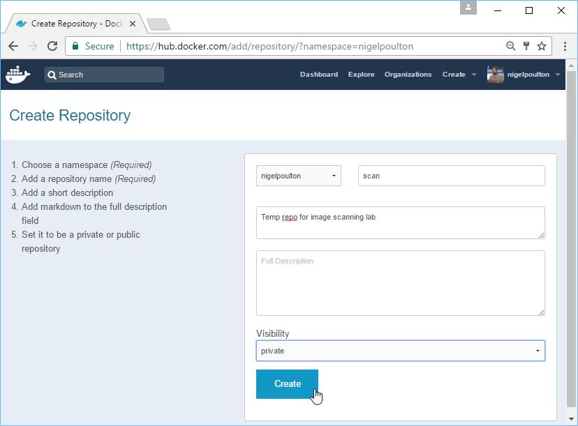 NOTE: This step assumes that you have a DockerHub account that will allow you to create a new private repo. If you have used all of the private repos on your account you will need to re-use one of them. If you do this you will need to take care not to interfere with images you already have stored in the repo. The only alternative is to upgrade to a plan that offers more private repos.