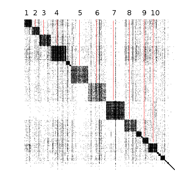 In this figure, both the x- and y-axes are the nodes (packages). The intersection between nodes is colored with a black dot if there is an edge between the nodes. The communities that we found are the set of large squares going down the diagonal of the matrix. The bigger the square, the more packages exist in that community. The "darker" the square, the more completelly connected that community is (i.e. very dark communities indicate that every package in that community depends on almost every other package in the community).