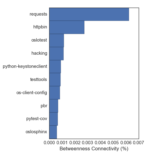 We can also try to determine important packages with the concept of "betweenness centrality". The idea here is to find the shortest path between every two nodes in the network. The betweenness centrality of a node is the fraction of these shortest paths that pass through the node. A good example is the airport network: Lots of planes pass through major hubs on the way to their destination, so they have high betweeness centrality. Here is the top ten by this metric: