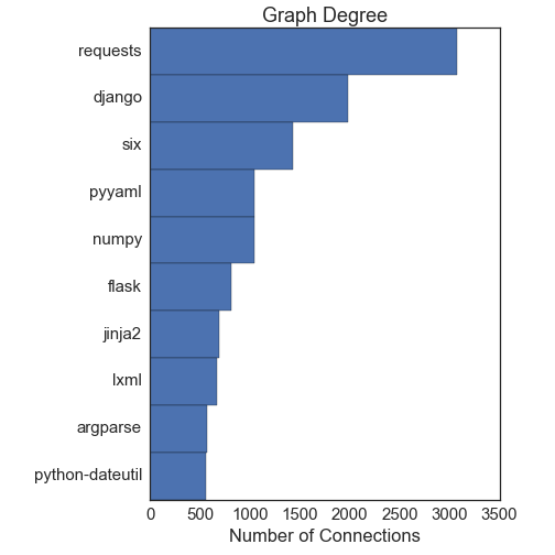 This is a power-law distribution, indicating that there are a few packages that many many things depend on, but most packages only have a few others that depend on them. We could have guessed this shape from the node centrality measures, which also look like power laws. What does a power-law degree distribution tell us about the graph? A likely explanation is a "rich get richer" scenario: packages that already have lots of stuff that uses them show up high on google search results, and so new package developers use them too. For example, almost all scientists use the matplotlib plotting package, and so their code all requires matplotlib. A much smaller set of python programmers use, for example, the bokeh library for plotting. The reason is likely simply because matplotlib is the first google result for "python plotting". This interpretation is supported by the fact that the most important packages tend to be fairly old; they have had more time to accumulate a critical mass of users.