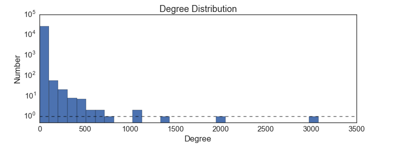 The last thing I will look at is a global property of the network: the distribution of how many edges there are for each node (how many packages each package depends on).
