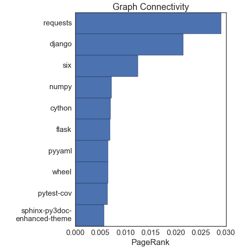 Both measures give more or less the same answers, and they agree well with intuition. The requests library is the most important node, followed by django. The numpy and cython packages are largely for scientific computing, another major component of the python ecosystem.