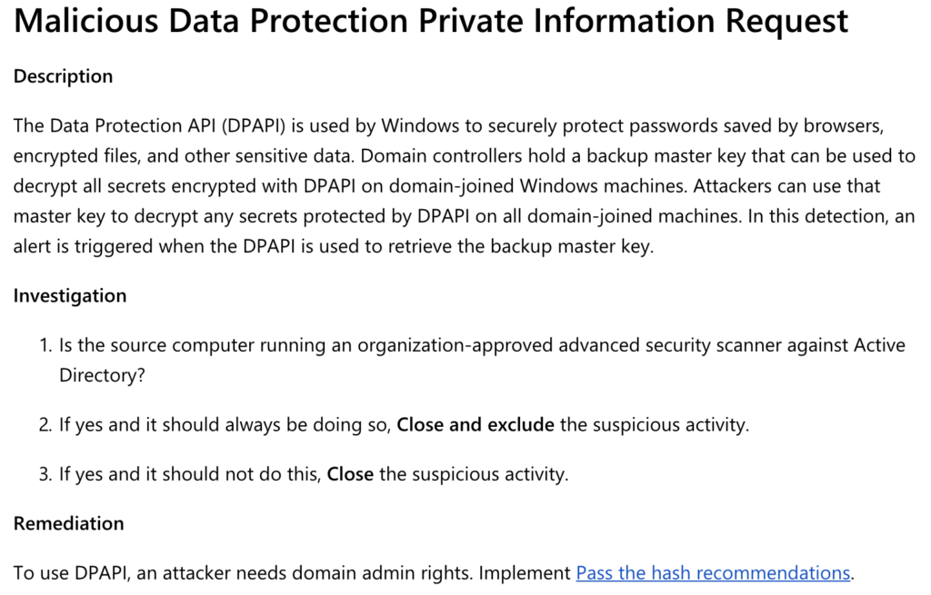 Defending against these types of DPAPI abuses is tough, mostly because this is just abuse of intended/existing functionality. Reading and decrypting DPAPI blobs is something that systems and applications do all the time, so there aren’t many opportunities to catch anomalies here.