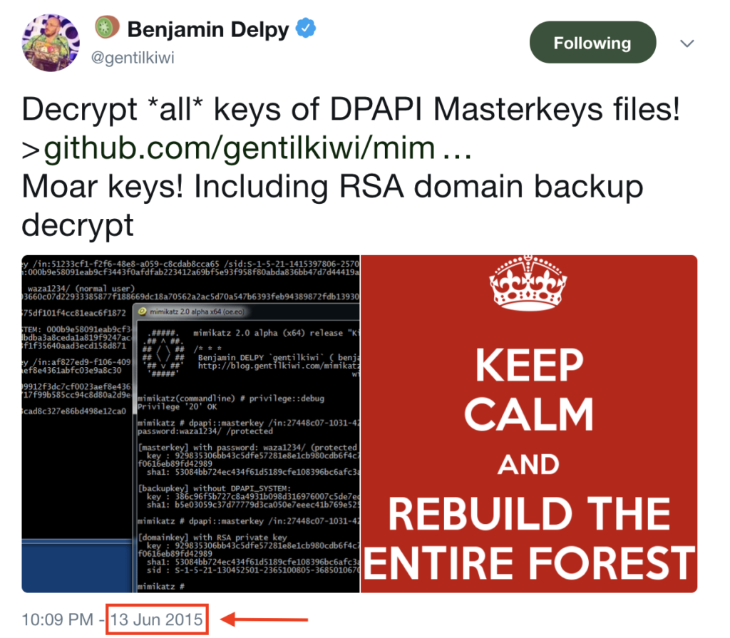 I’ve spoken about DPAPI (the Data Protection Application Programming Interface) a bit before, including how KeePass uses DPAPI for its “Windows User Account” key option. I recently dove into some of the amazing work that Benjamin Delpy has done concerning DPAPI and wanted to record some operational notes on abusing DPAPI with Mimikatz.