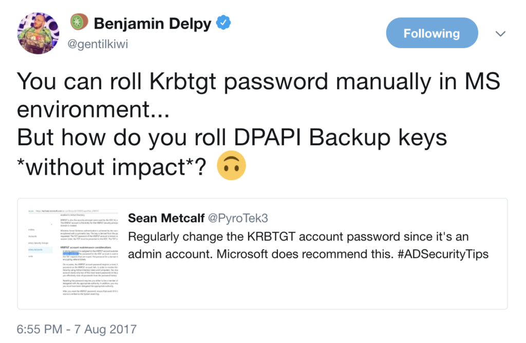 I’m not sure of the best defensive guidance for the use of the BackupKey Remote Protocol (MS-BKRP) or the remote DPAPI backup key retrieval, but I wanted to note a few thoughts on each.