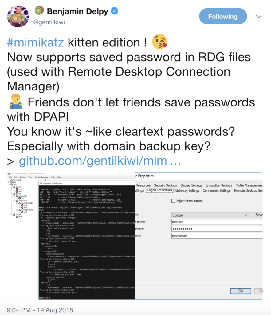 - @_rastamouse’s great post on jumping network segmentation, which includes a section on using Mimikatz to decrypt DPAPI-encrypted RDP credential blobs