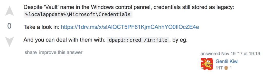 There are a few ways to get at these vaulted credentials. If the credential is a saved Internet Explorer/Edge login, these credentials can be enumerated using a series of API calls from vaultcli.dll. This can be done with the Mimikatz vault::list module, Massimiliano Montoro’s Vault Dump code, Matt Graeber’s PowerShell port of the same code, Dwight Hohnstein‘s C# port of Graeber’s code, or Seatbelt‘s shameless integration of Dwight’s C# code (seatbelt.exe DumpVault .) However, you’ll notice something interesting when running these code bases: not all vault credentials are returned. Why? 🤔