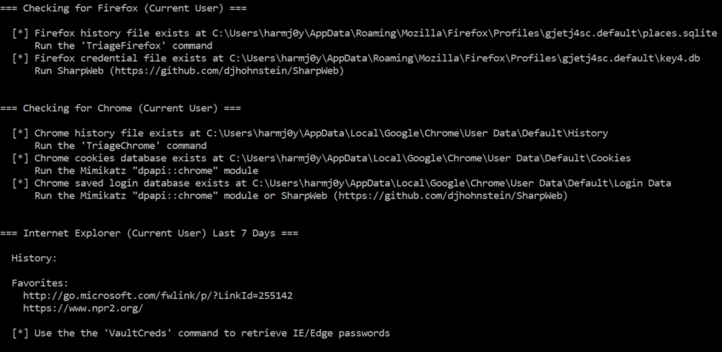 This will point you to the appropriate Seatbelt command, Mimikatz module, or command from @djhohnstein‘s awesome new SharpWeb project.