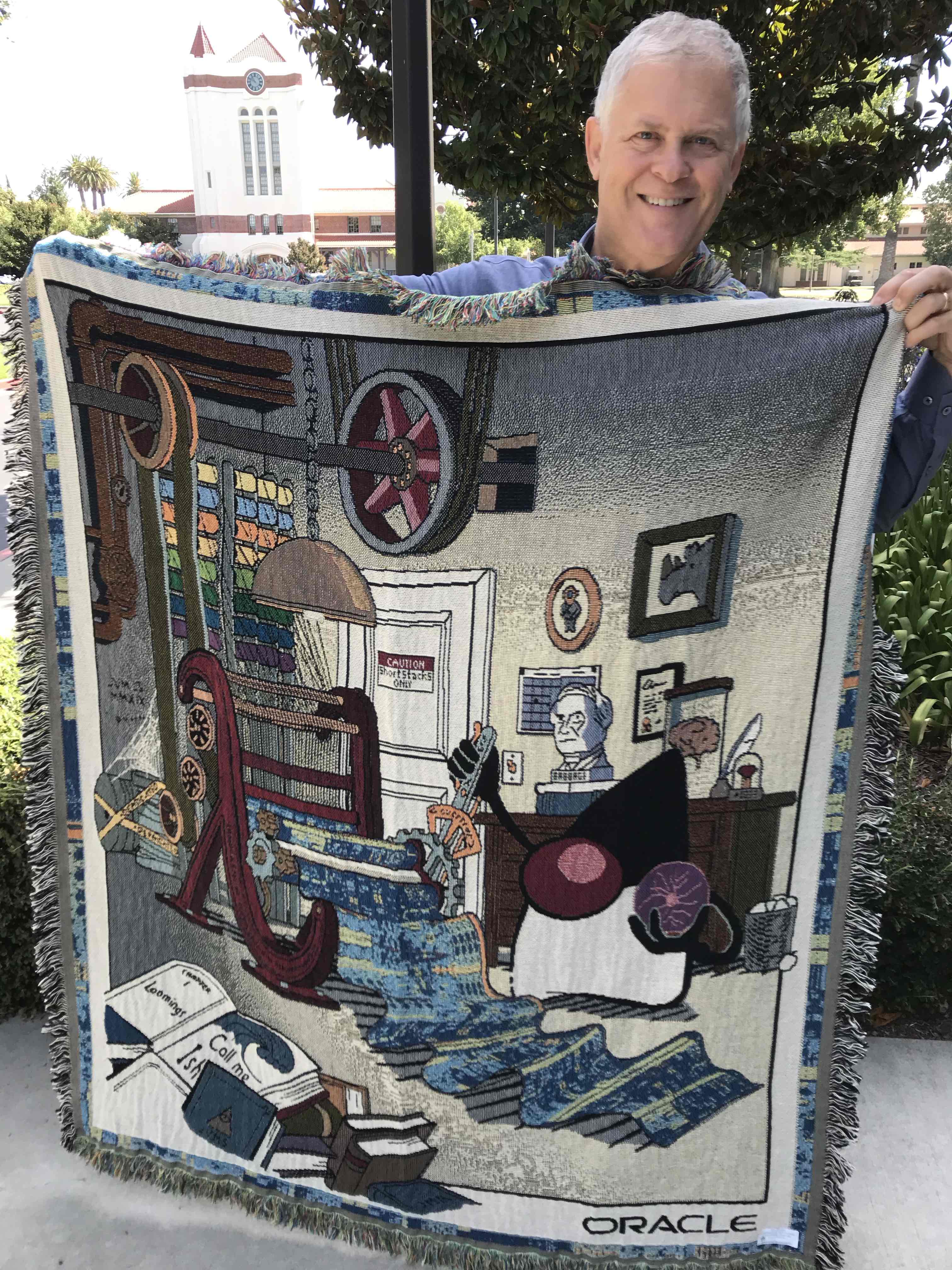 Nowadays it’s not all that expensive to convert digital art into any number of different physical artifacts. The JVMLS gifts, each with their own artwork, have taken various forms over the years: shirts, hoodies, beach bags, towels, steel mugs, and now tapestry blankets. Such a blanket is made from many small threads of brightly colored thread, cleverly woven together so that the exposed threads will collectively present some desired image. It’s almost as if we chose a medium which would exemplify our message! By the way, digitally programmed cloth is old technology: In Queen Victoria’s day they used punched cards to run their Jacquard looms.