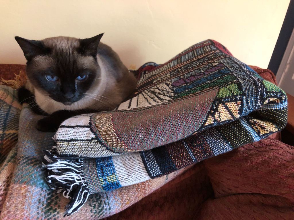 It’s a tapestry throw blanket, about 50 by 60 inches, made via an inexpensive commodity process. You can buy many such things easily; just search for “tapestry throw blanket” on Google, Amazon, Etsy, etc. Here’s what it looks like: