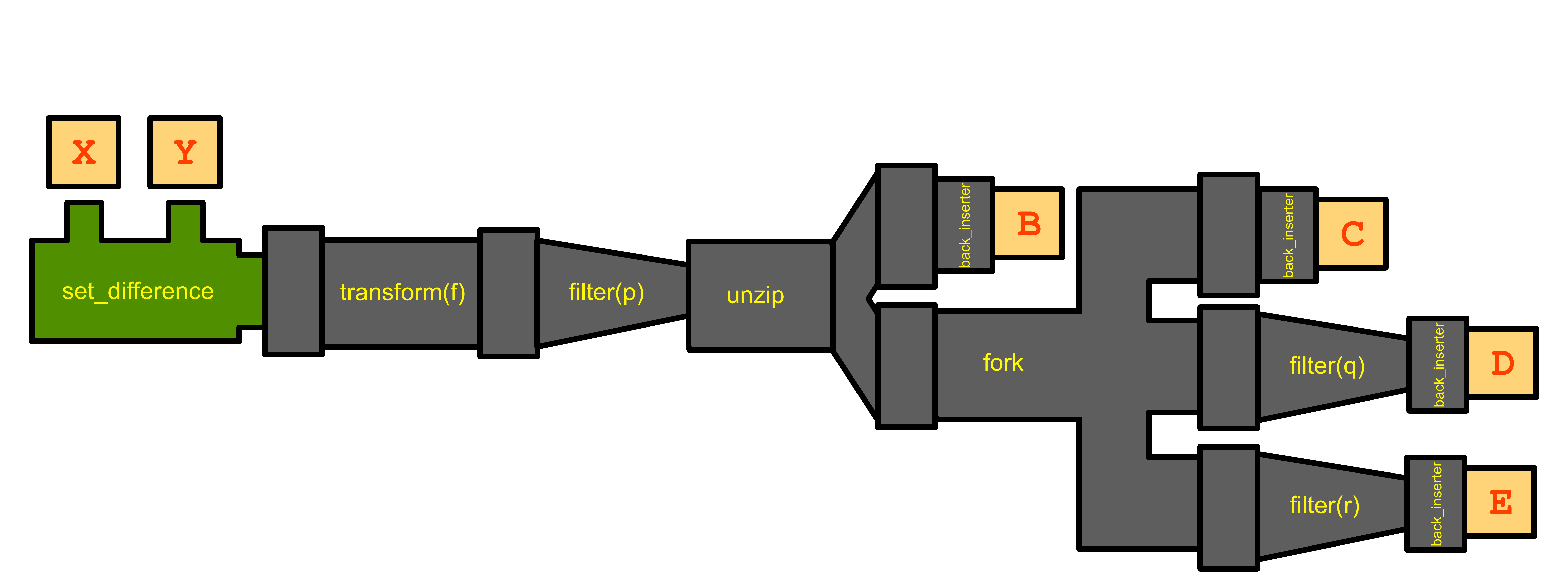 pipes::filter(r) >>= pipes::push_back(E));Here, unzip takes the std::pairs or std::tuples it receives and breaks them down into individual elements. It sends each element to the pipes it takes (here pipes::push_back and fork).