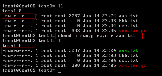 示例:修改/test 下的 aaa.txt 的权限为文件所有者有全部权限,文件所有者所在的组有读写权限,其他用户只有读的权限。