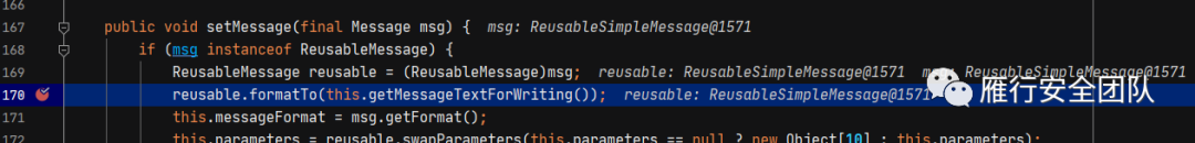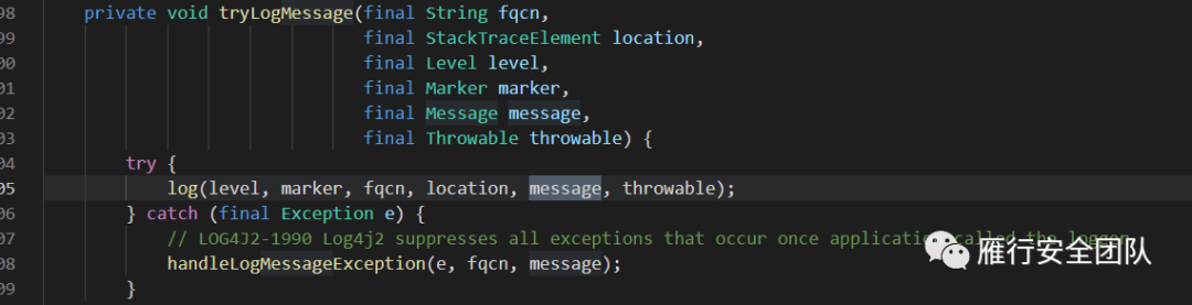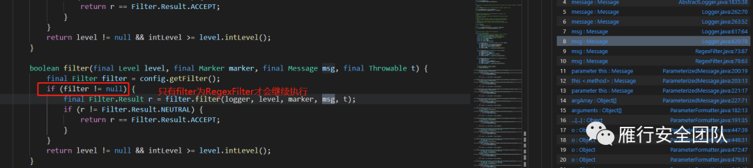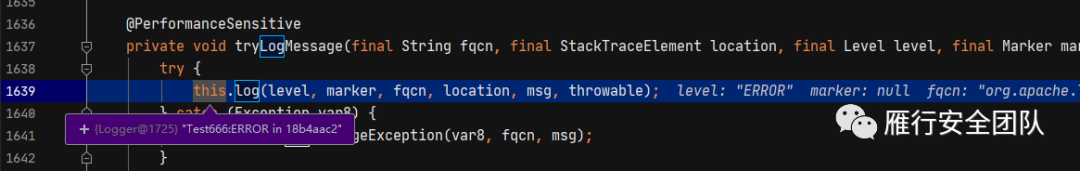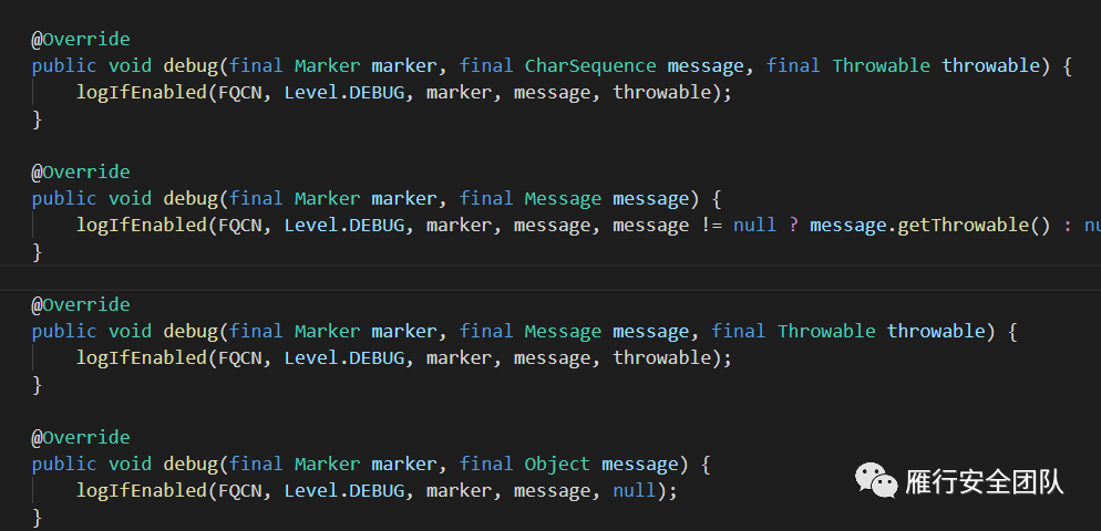在Log4j作为日志记录的工具,除了从HTTP请求中获取输入点外,还可以在记录日志请求或者解析配置文件中来获取source。先不看解析配置文件获取source的点了,因为这需要分析Log4j解析配置文件的流程比较复杂。所以目前我们只考虑通过日志记录作为source的情况。稍微了解Log4j的同学都知道,Log4j会通过error/fatal/info/debug/trace等方法对不同级别的日志进行记录。通过分析我们可以看到我们输入的message都调用了logIfEnabled方法并作为第四个参数输入,所以可以将这里定义为source。