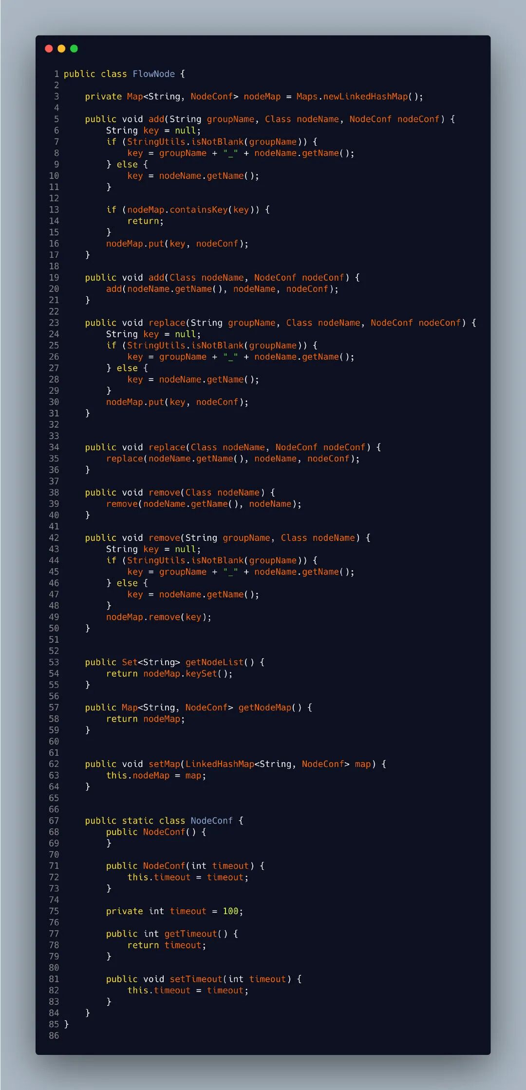 第二步创建我们的流程节点,这相当于就是保存我们整个流程中需要执行下游服务的节点,以Map作为保存数据,NodeConf 节点设置参数,自定义请求服务超时时间(因为并行我们是用的线程池或者通过get设置时间get返回值结果)