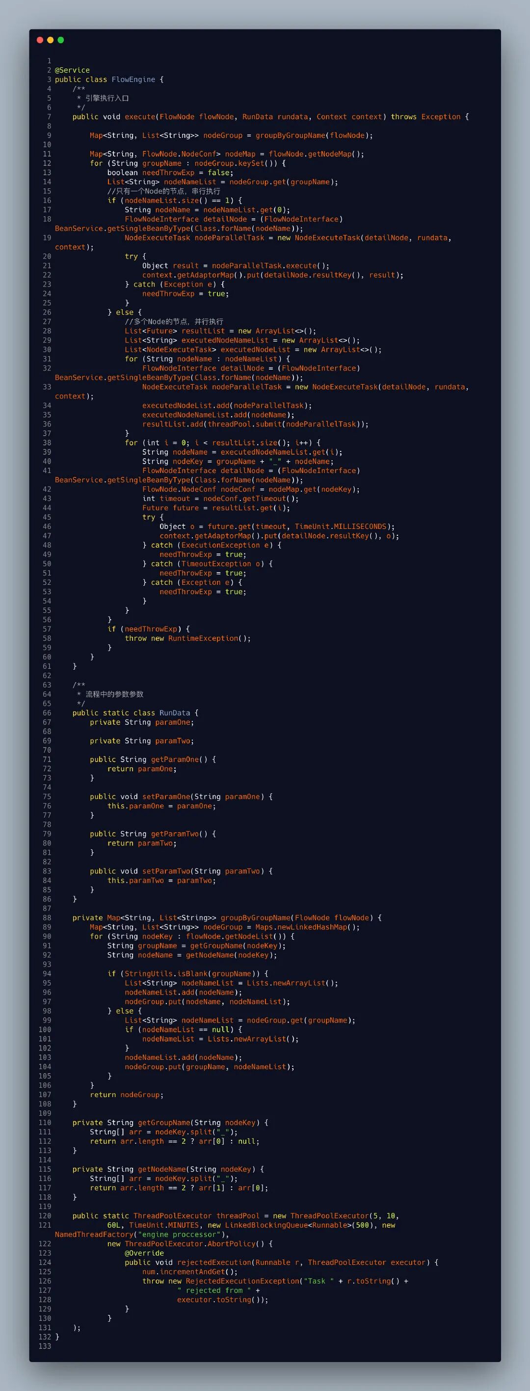 第三步引擎类,这个也是我们的核心类。通过我们添加的node节点判断我们哪些流程是需要串行的那些是需要并行的,通过线程池创建线程放入Feature中,来达到同步执行的效果。