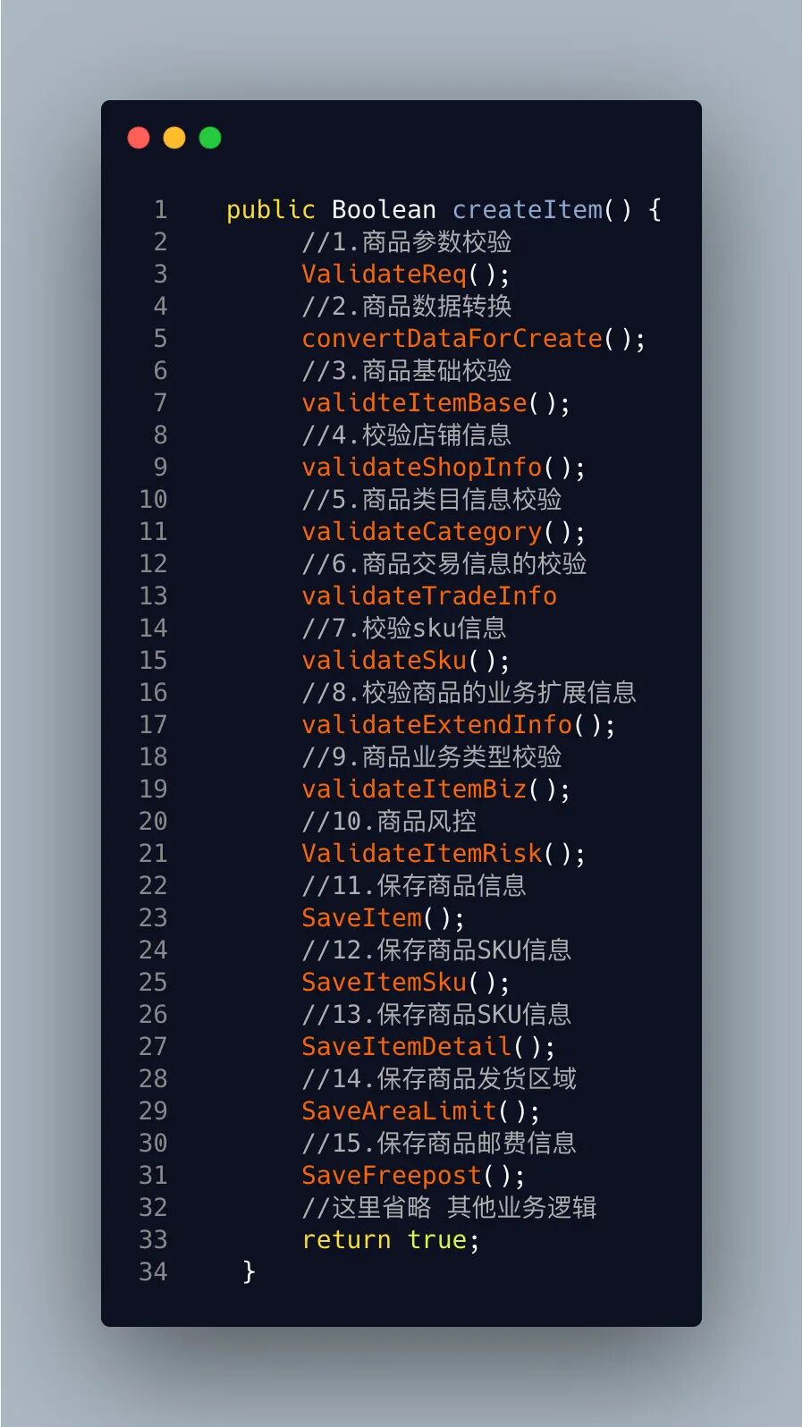 参数必填性校验 参数数据转换 商品基础信息校验 商品与商家之间的校验 类目信息校验 商品交易信息校验(这个看公司业务决定) SKU相关信息校验 商品是否需要有特定标签校验(看公司业务决定) 商品类型校验(普通,卡片,视频.......) 商品风控校验 保存商品信息 保存SKU信息 保存商品详情信息 重量模版 运费 配送区域 。。。。。。。