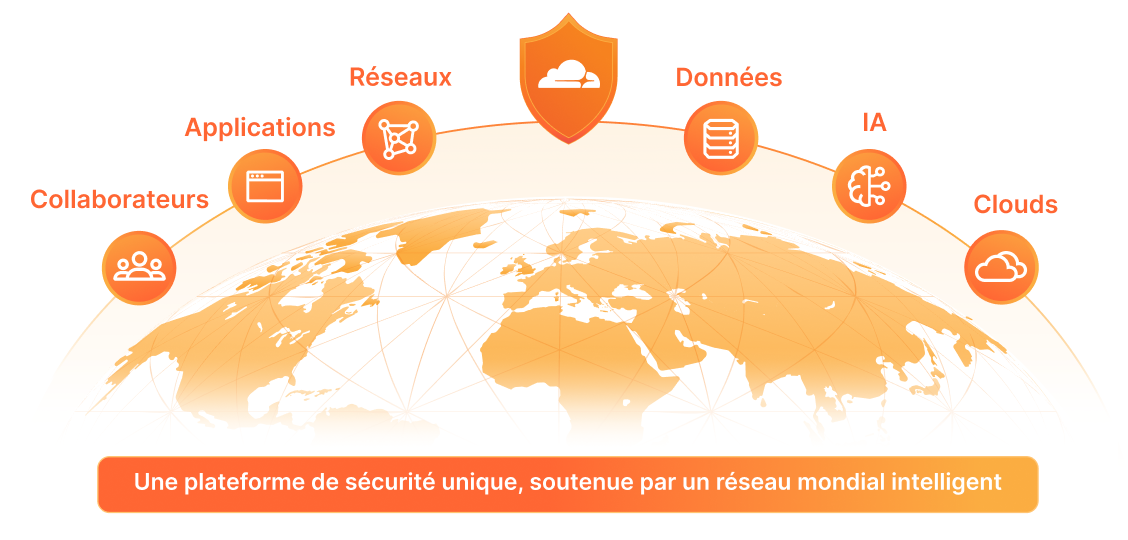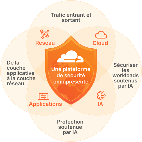 Les solutions de sécurité totalement intégrées et soutenues par IA de Cloudflare (sécurité des applications, SASE/SSE et sécurité réseau) sécurisent à la fois le trafic entrant et sortant sur l'ensemble des environnements : réseau, applications et trafic utilisateur.