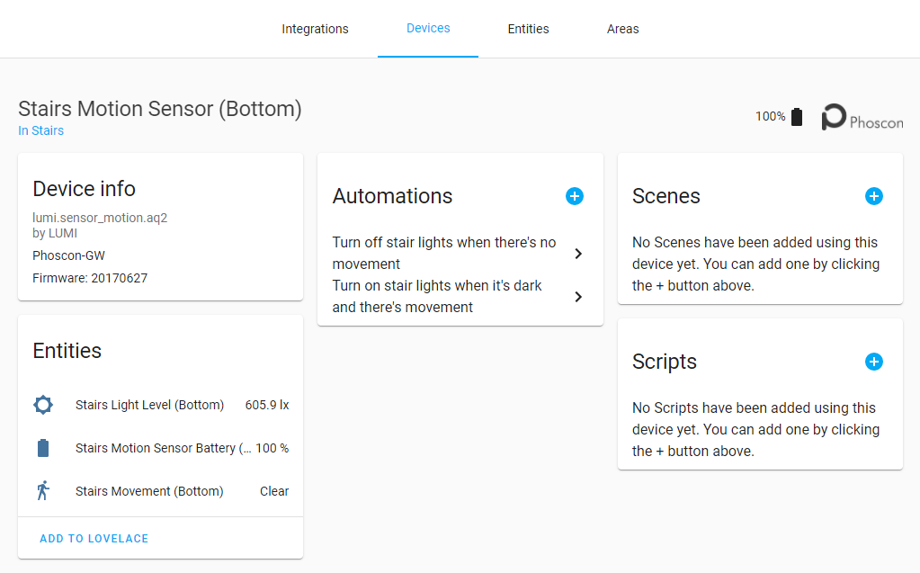 The motion sensor is a device I placed at the bottom of the stairs in my house which spans 3 floors. I have another motion sensor halfway along near the kids' room and another again at the top near our master bedroom. These motion sensor devices each have 3 different entities: