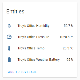 This nomenclature threw me a bit at first but it makes sense: one physical device you can hold in your hand may measure many different things and each one of those things is considered to be an entity (entities aren't just about measurement but let's use that as a simplistic example for the moment). I have little temperature sensors in each room and each one of those devices can measure humidity, pressure, temperature and has a battery state: