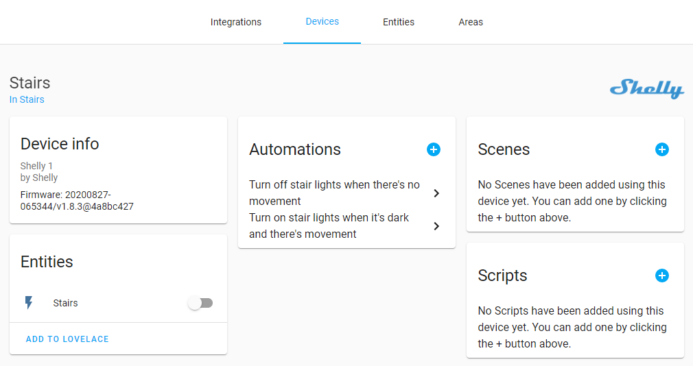 - If motion is detected at the bottom, middle or top of the stairs and the light level down the bottom is beneath 200 lumens, turn the Shelly on the light switch on