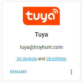 Earlier on, I lamented that everyone wants to be the hub of your IoT world and that fortunately, HA can play that role in the place of one of the large incumbent tech companies. Mostly. The gap comes when you start using products from one of those companies that expect to communicate with IoT devices via their own proprietary product. For example, both my kids have an Amazon Echo Dot in their room. I put these in there in part because they're fun learning devices they can easily ask questions of (they can also ask "Alexa, who's Troy Hunt" and get an answer or, as I learned last night with my daughter, they can ask "Alexa, is Troy Hunt handsome" and get a resounding "He is handsome" 🤣), and in part to control their IoT-enabled devices. The latter can be done without even needing HA as Tuya natively integrates with Alexa and exposes all the devices: