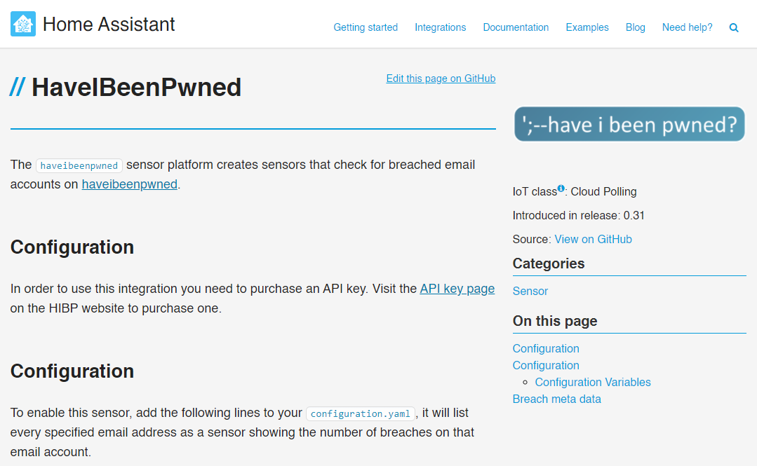I've left other integrations in the screen cap above to give you a sense of some of the other things HA can communicate with: Alexa, WeMo switches, Elgato key lights and many other connected devices in my house. At the time of writing, there are 1,713 different integrations including... a Have I Been Pwned Integration!