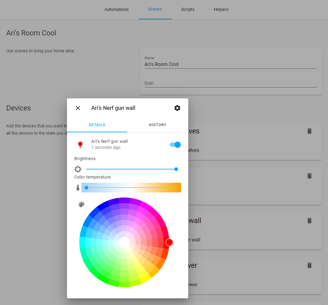 But that automation just turns on a single light, what if I wanted to turn on more lights? Or play music? Or set other device statuses, all at the same time? This is where we get to "scenes" which allow you to define multiple pre-set states that can all be switched on in one go. For example, Ari wanted a fast way to get all his lights back to the same state he referred to as "cool", so we made a scene that turned on a bunch of lights and set the nerf gun wall to red: