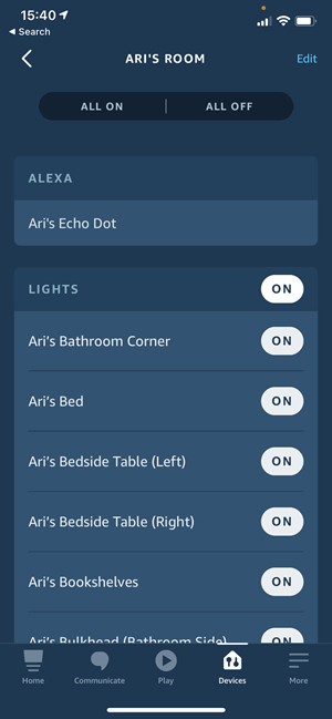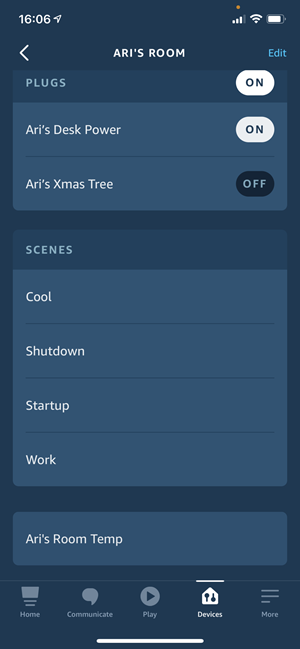 But there are other things in HA which we might still want to access via Alexa, for example the "cool" scene I set up for Ari earlier on. To do that we need to surface data from HA into Alexa which can be done with the Amazon Alexa integration. Once configured, the scene appears and he can talk to the Echo Dot and ask Alexa to "turn on cool in Ari's room":